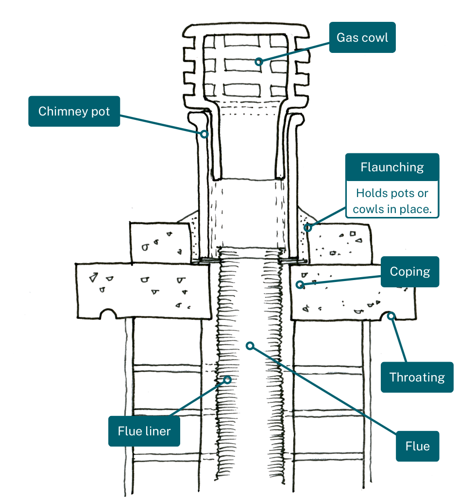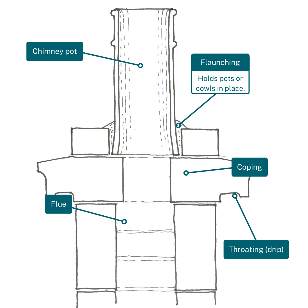 Found on tenement walls, these chimneys require height for optimal airflow. Rebuilding may involve installing wide copings to protect underlying stonework.